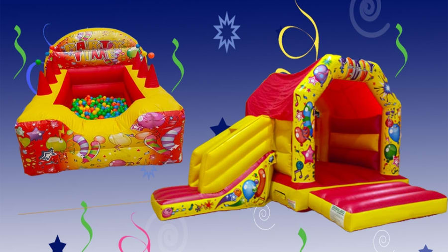 This Party Time Bounce & Slide Combo Bouncy Castle and Red & Yellow Ball Pit package is available for hire across Merthyr Tydfil, Aberdare, Caerphilly, Glynneath, Neath, ensuring we can bring the party to you, wherever you are in the region.
